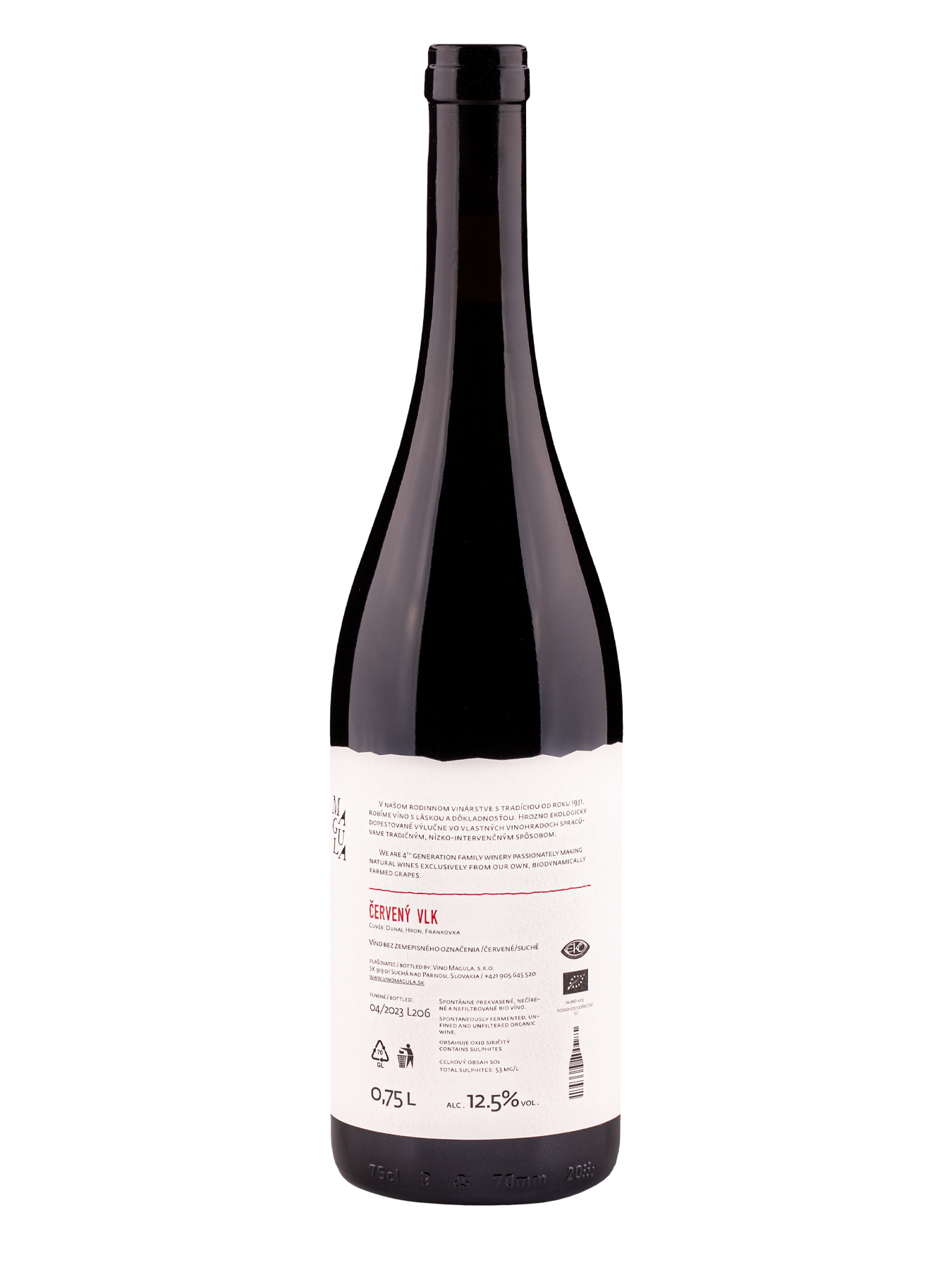 Červený vlk je slovenský bordeaux blend – spája sa v ňom Dunaj a Hron, výnimočné slovenské novošľachtence, ktoré sú intiutívne milované širokými vrstvami vínomilcov a pre ktoré my, vinári, ešte stále hľadáme tú správnu formu. V našom vinárstve sme sa rozhodli vybrať cestou ich spojenia a už prvý ročník naznačuje, že to bude výnimočná záležitosť! Zamatovo čokoládový Dunaj s paprikovým Hronom spoločne tvoria plnokrvné a mohutné červené víno klasického štýlu, poriadne vyzreté v dubových sudoch. Spontánne prekvasené nečírené a nefiltrované bio víno – divoká radosť vo fľaši!